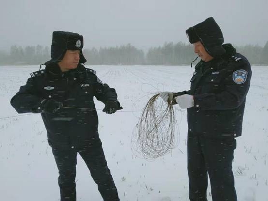 十八站公安分局:民警顶风冒雪拆除捕猎电网